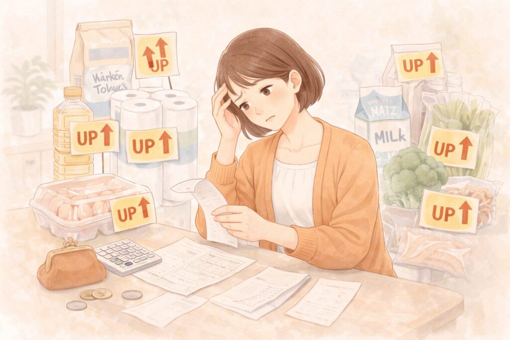 今回の値上げで私が怖いと感じたのは、「体感しにくいのに確実に効いてくる」という点です。1品あたり数十円〜100円ほどの値上がりなので、「また少し上がったな」という実感はありますが、その場で「高い!」と気づきにくい。でも、月末に家計簿を見ると、食費が1,000円、2,000円とじわじわ増えている。そういう種類の痛みなんです。